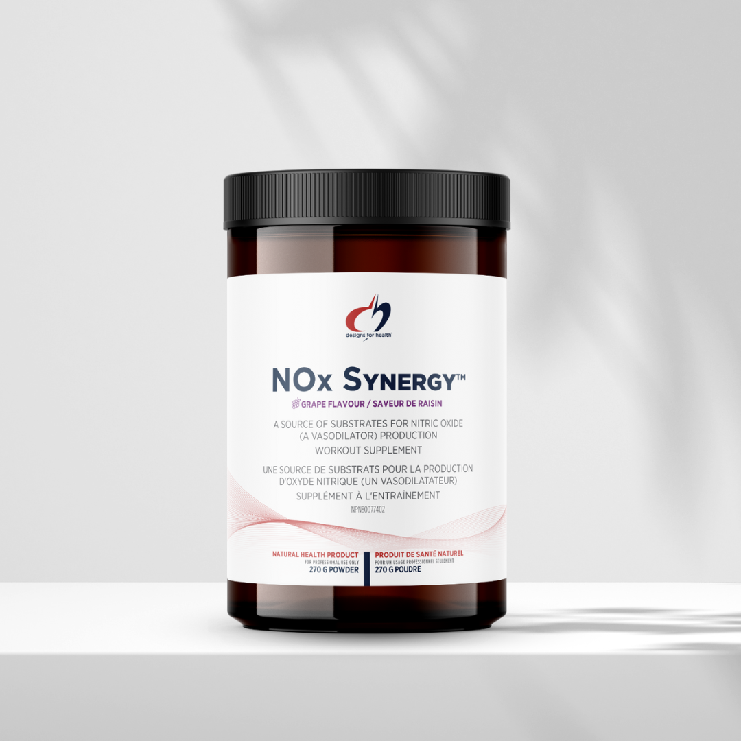 NOx Synergy™ by Designs for Health is a synergistic formula designed to optimize nitric oxide (NO) levels in the body. The ingredients in this formula work to help increase the synthesis and decrease the degradation of nitric oxide, which is beneficial for cardiovascular function, circulation and muscular performance.